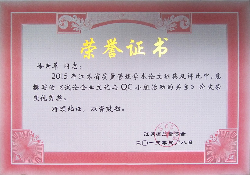 由江蘇省質(zhì)量協(xié)會舉辦的2014年江蘇質(zhì)量管理學術(shù)論文征集評選活動落下帷幕,5月8日在南京華江賓館召開了江蘇質(zhì)量管理學術(shù)論文表彰暨交流會,江蘇省質(zhì)量技術(shù)監(jiān)督局副局長張前、質(zhì)量處處長兼省質(zhì)量協(xié)會副秘書長祁寧清、省質(zhì)量協(xié)會會長耿寧等及獲獎作者參加了會議。集團公司徐世革同志的《試論企業(yè)文化與QC小組活動的關(guān)系》榮獲優(yōu)秀獎。
