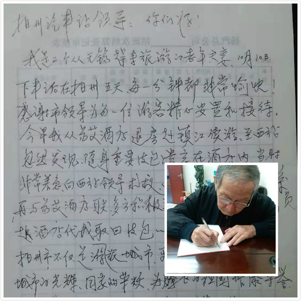 張師傅知道自己遺忘在賓館的挎包有了著落,開心不已,在工作人員去取包的間隙,在紙上認(rèn)認(rèn)真真、工工整整地寫下了一位老人內(nèi)心由衷的感激之情。