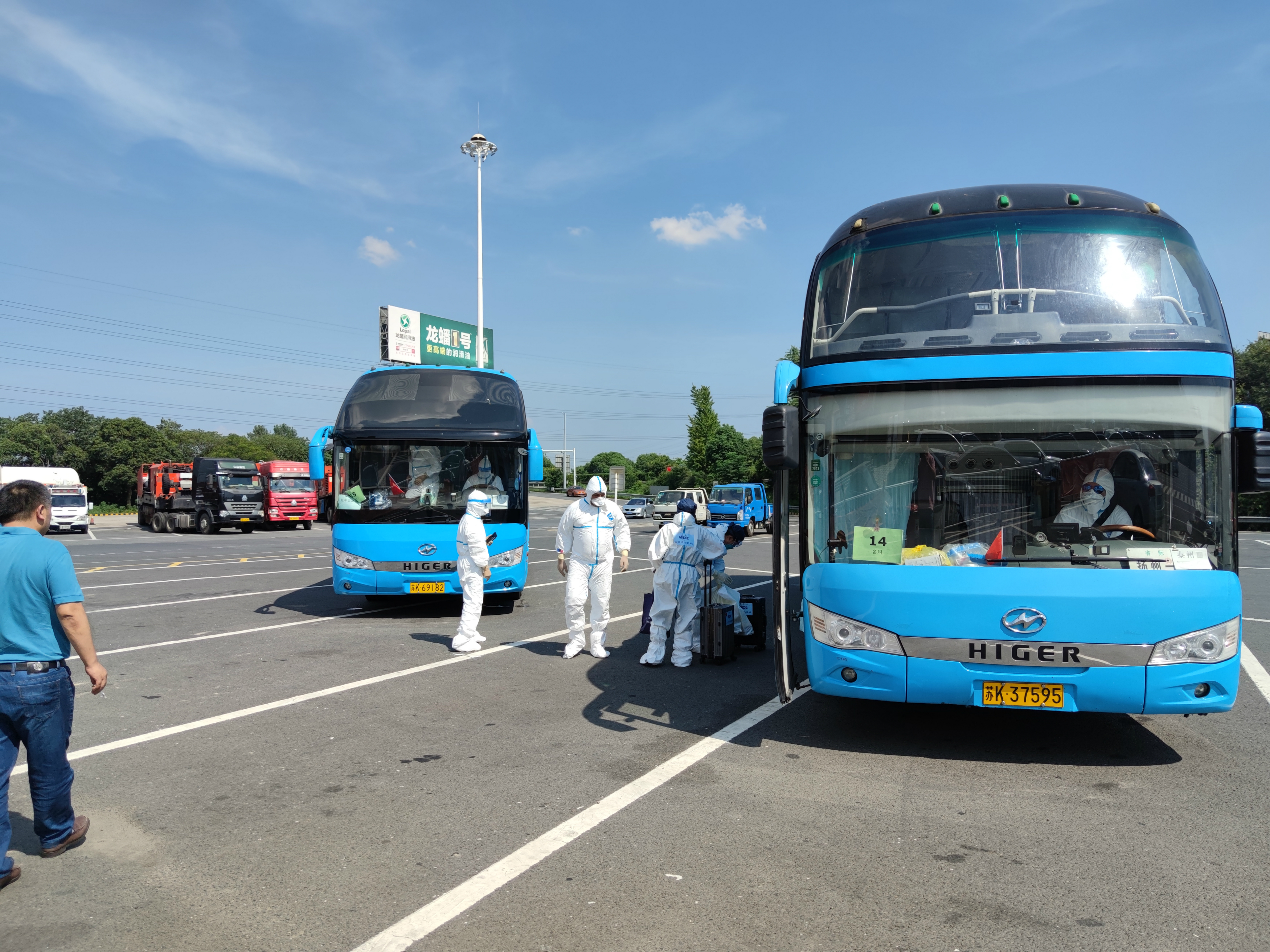 8月15日上午,16輛揚(yáng)汽藍(lán)色大巴整齊有序的停在機(jī)場(chǎng)預(yù)定位置,等候著滿載境外返揚(yáng)人員的包機(jī)在揚(yáng)泰機(jī)場(chǎng)降落。