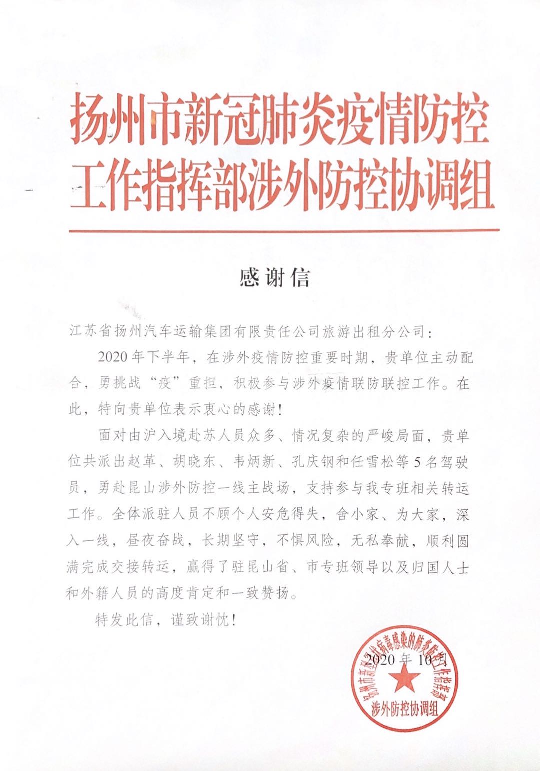 十月下旬,一封承載著市疫情防控指揮部贊譽(yù)的感謝信送至旅游出租分公司。疫情防控指揮部對第二批參加境外返揚(yáng)人員轉(zhuǎn)運(yùn)工作的五名駕駛員給予了高度評價,信中表示,他們在昆山涉外防控一線,長期堅守,晝夜奮戰(zhàn),不懼風(fēng)險,無私奉獻(xiàn),順利圓滿完成交接轉(zhuǎn)運(yùn),贏得市專班領(lǐng)導(dǎo)以及歸國人士和外籍人員的高度肯定和一致贊揚(yáng)。