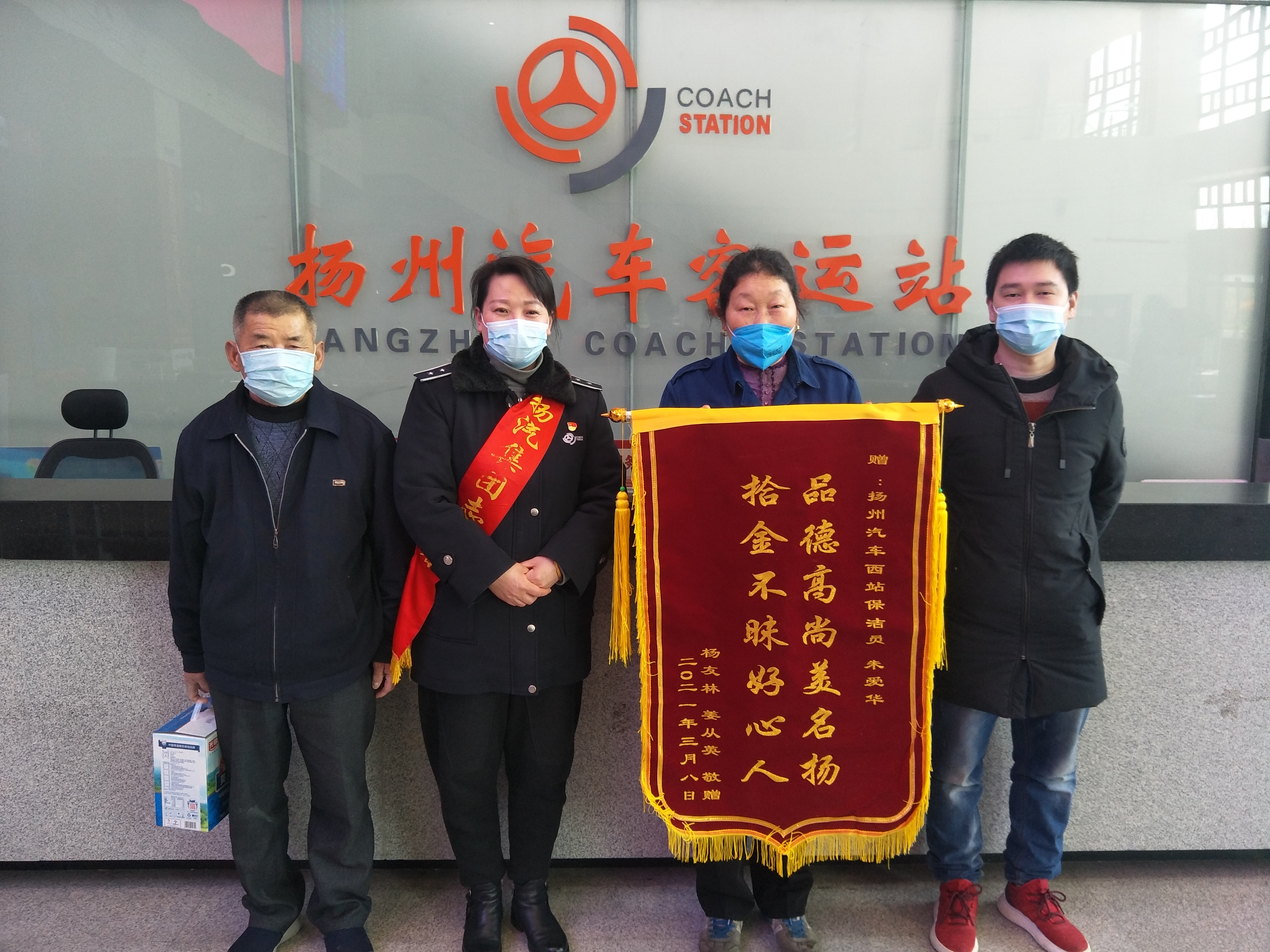 “品德高尚美名揚,拾金不昧好人心”,3月22日上午,揚州汽車站收到一面來自旅客的錦旗,對車站保潔員朱愛華拾金不昧的品德和工作人員熱情周到的服務(wù)表示了高度贊揚和誠摯感謝。