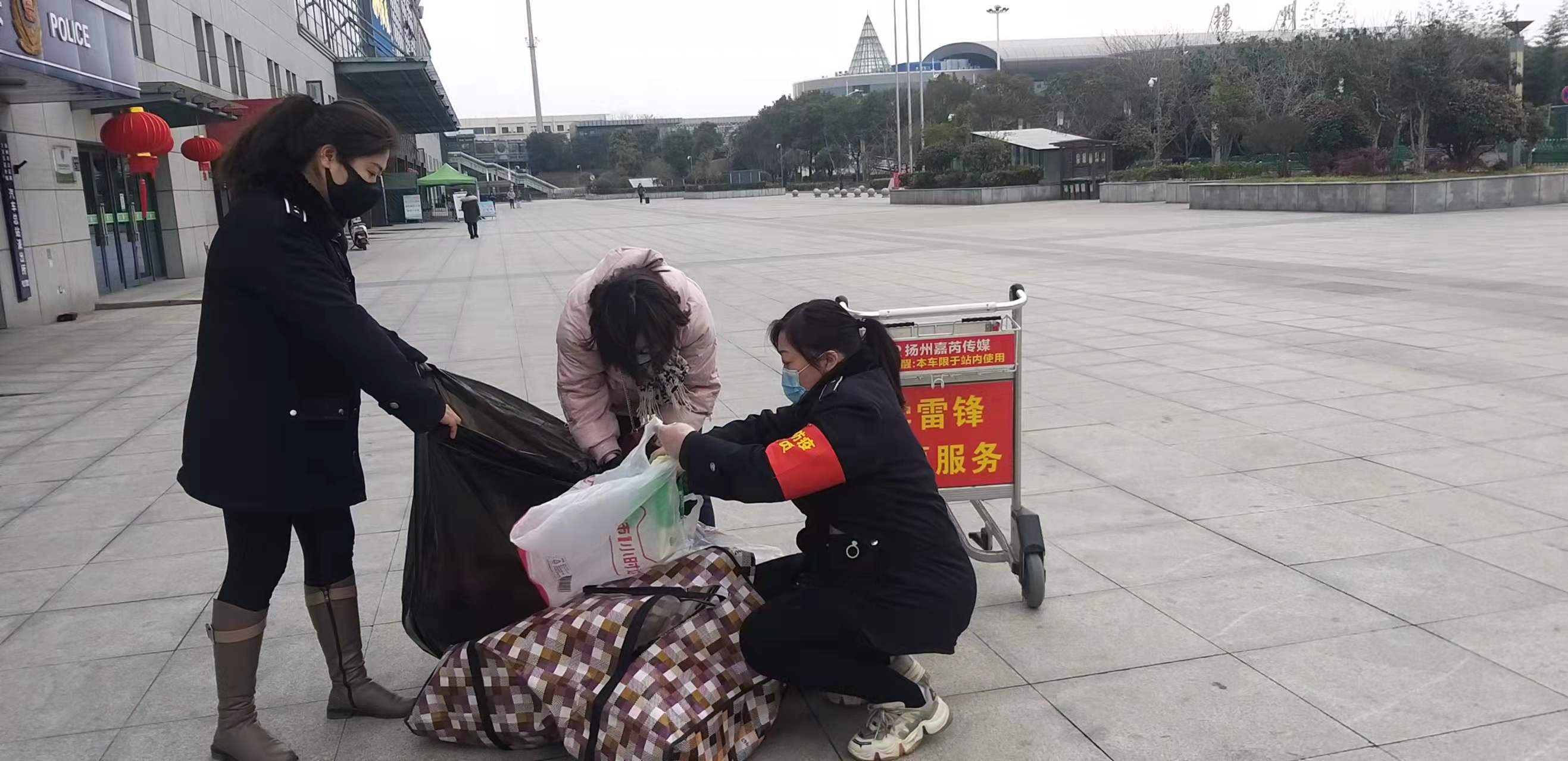 1月29日下午4點時分,西部客運樞紐揚州汽車站務中心工作人員殷丹和薛揚,日常工作巡查時,在站前廣場進口處,看到一名旅客蹲在地上,手里抱著散落一地的行李無計可施,焦急萬分。
