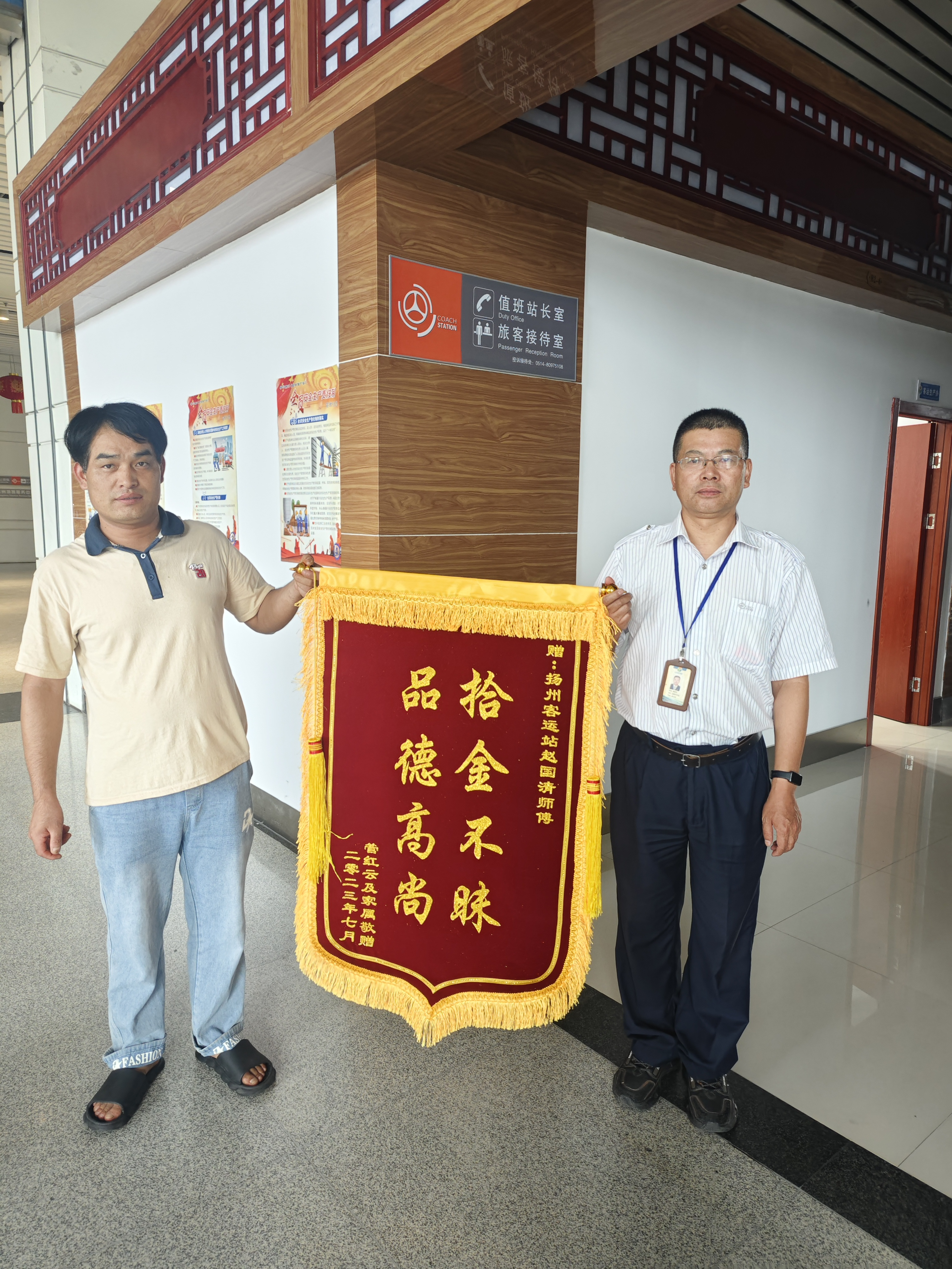 7月18日,揚(yáng)州汽車站值班室收到一面“拾金不昧,品德高尚”的錦旗。這位拾金不昧的職工叫趙國清,是一位有著41年工齡即將退休的老職工。
