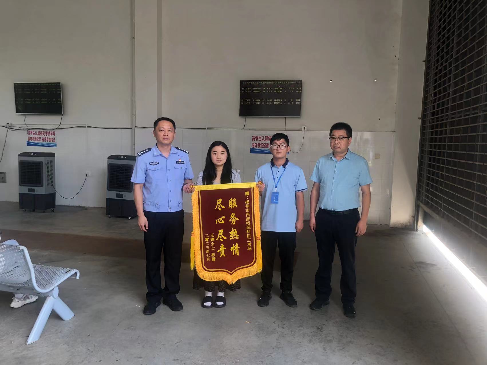 7月27日,揚州西部客運樞紐科目三考場收到了一面錦旗,印有“熱情服務(wù),盡心盡責(zé)”,王婷女士將錦旗交至車管所監(jiān)管人員和考場負(fù)責(zé)人手中,對現(xiàn)場工作人員的幫助表示感謝。