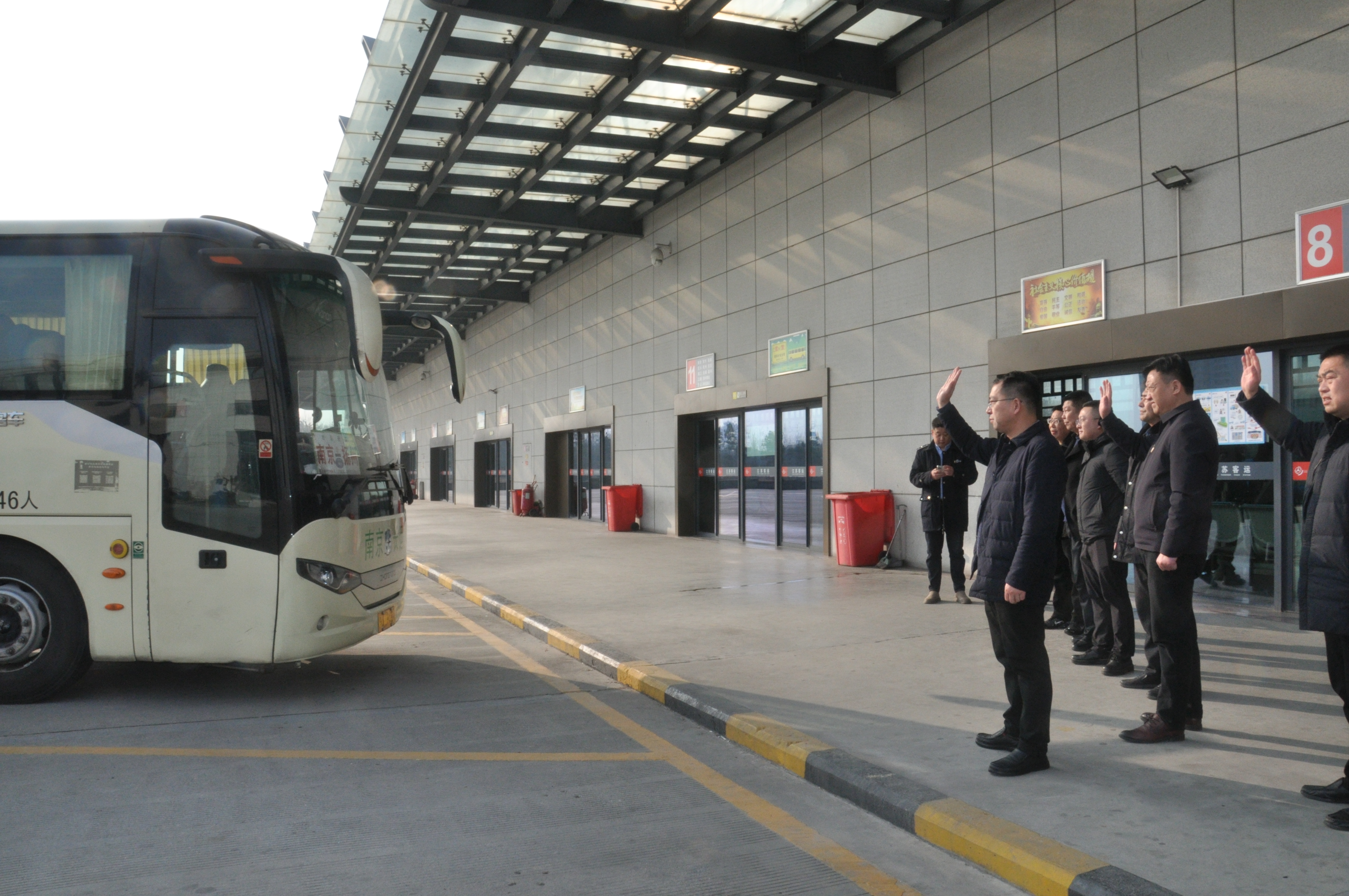 下午3點40分,發(fā)往南京南站的大巴正緩緩駛出車站。這是除夕當天發(fā)出的最后一班“團圓班車”。龔宇峰一行為最后一班車的旅客送上了新春的祝福,并再三囑咐駕駛員謹慎駕駛,確保將乘客安全送達目的地。他們還向堅守在一線的廣大干部職工表示了誠摯的慰問與關懷。在大家的揮手告別中,大巴車緩緩離開了發(fā)車平臺。至此,揚州汽車客運站節(jié)前的最后一批旅客踏上了返鄉(xiāng)的團圓之路。